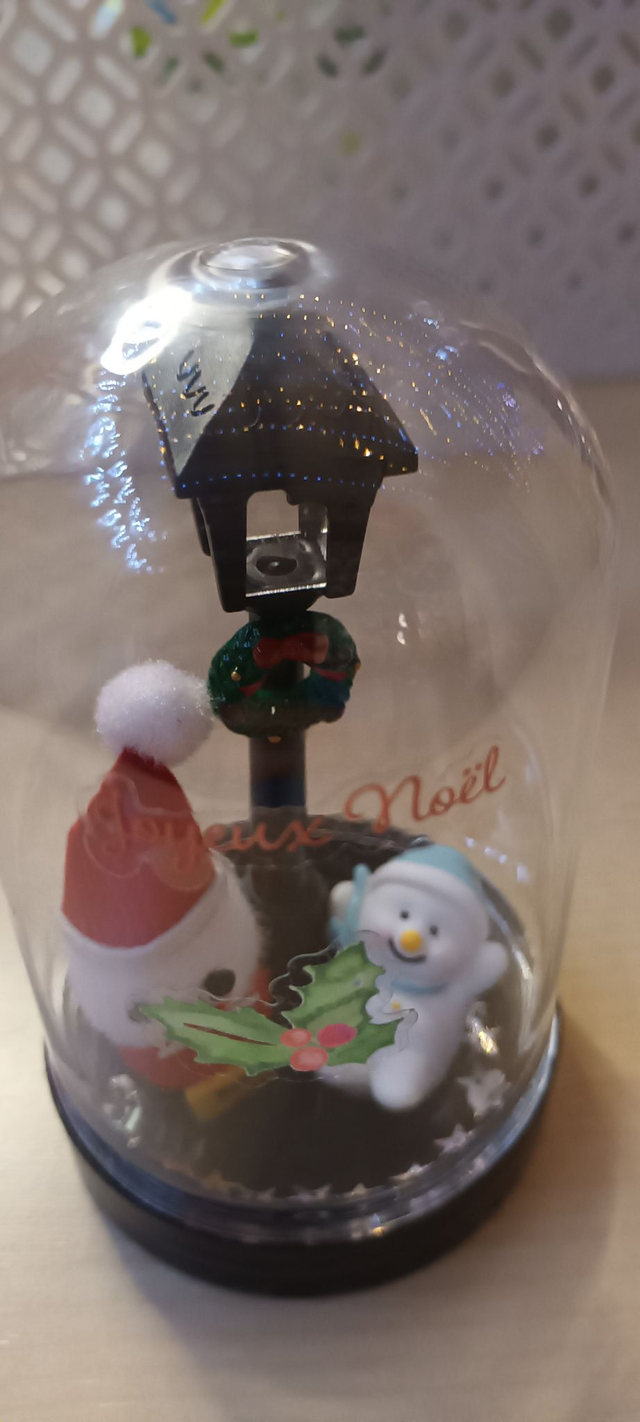 Décoration de noël : sous cloche avec un lampadaire et son bonhomme de neige et un père noël .