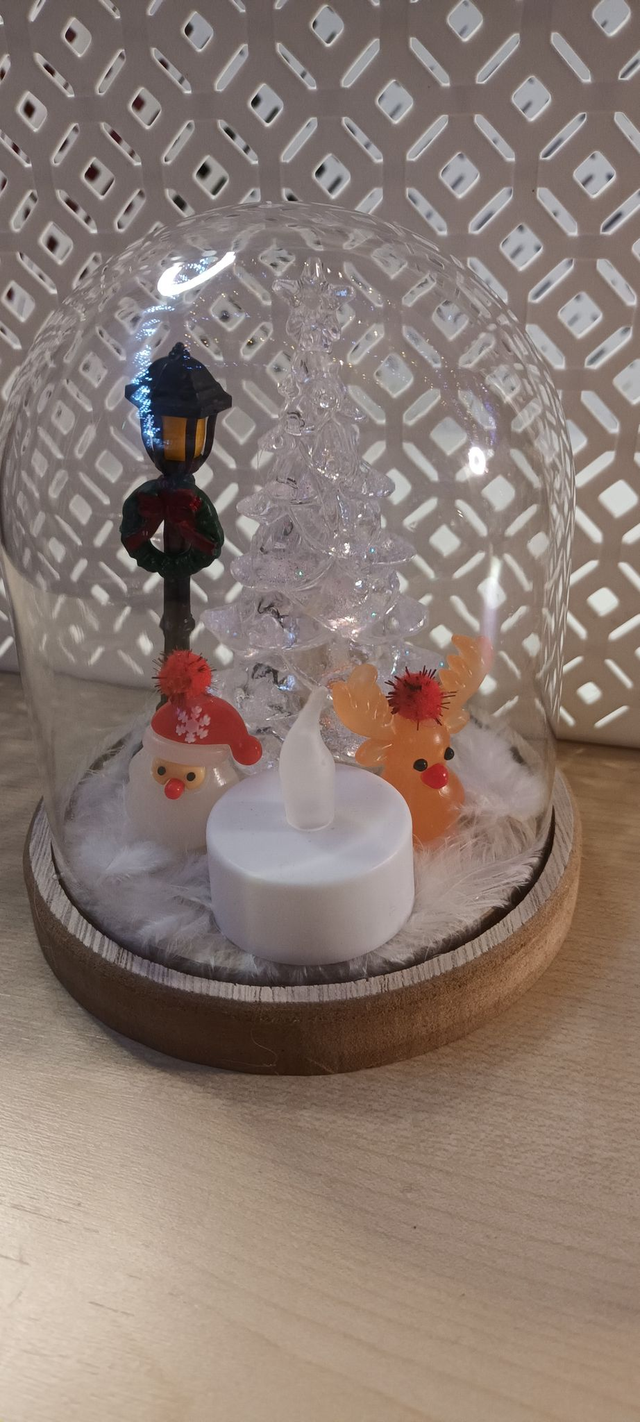 Décoration de noël : sous cloche avec 2 personnages de Noel , un lampadaire et un sapin et sa bougies LED à pile .