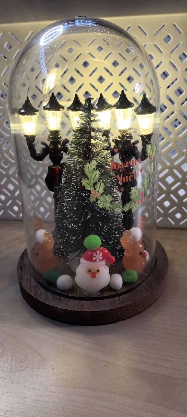 Décoration de noël : sous cloche avec 2 lampadaire a pile , un sapin de noël , 2 rennes et 1 père noël .