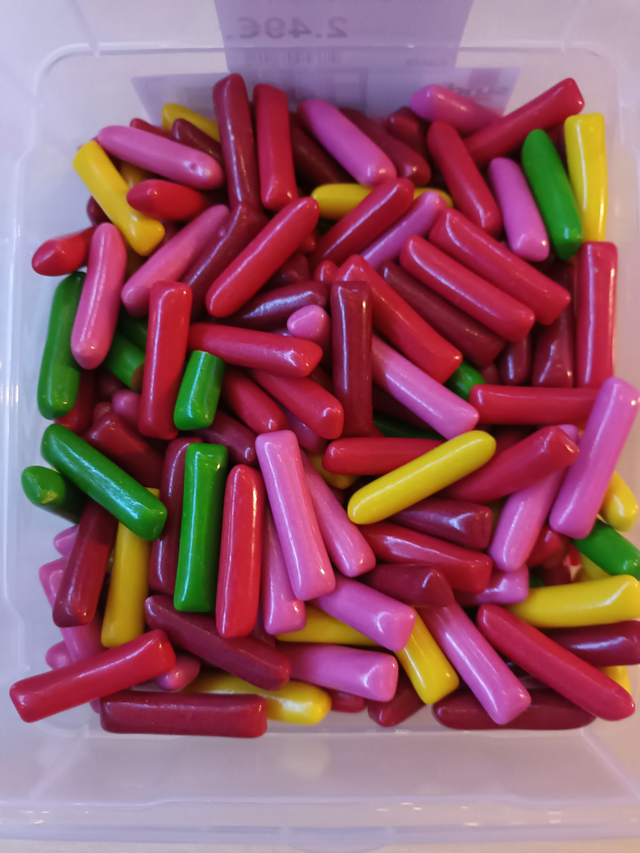 - Ingrédients : (sous réserves de modifications par le fabricant) Sucre, sirop de glucose, graisse de palme, jus de fruits à base de concentrés (pomme, pêche, citron, fraise, framboise), gélatine bovine, stabilisant : gomme arabique, amidon modifié, acidifiants : acide lactique, acide citrique, arômes, émulsifiant : lécithines, colorants : carmins, crucumine, bleu pbrillant FCF, charbon végétal médicinal, dextrose, agents d'enrobage : cire de carnauba, shellac, cire d'abeille blanche et jaune.